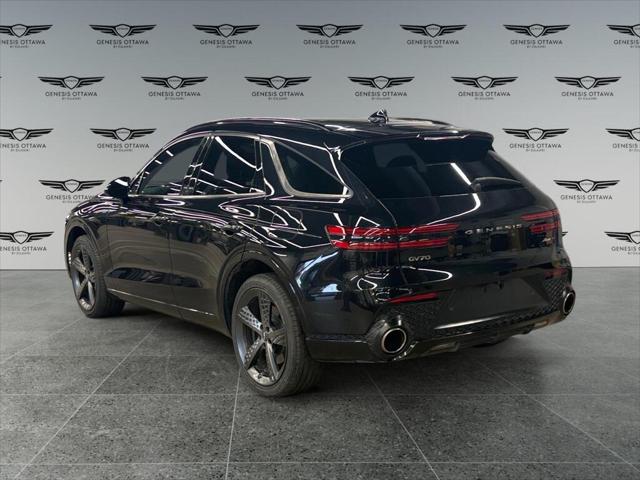 The 2023 Genesis GV70 3.5T Sport AWD is a bold black SUV designed to deliver exhilarating performance with its robust 3.5L 6-cylinder engine and refined automatic transmission. Its all-wheel-drive system ensures superb handling and stability perfect for those who crave a dynamic driving experience. This sophisticated vehicle boasts alluring black exterior alloys elegant lines and a striking presence on the road. Inside the black leather upholstery and aluminum instrument panel create an opulent atmosphere. The spacious cabin is packed with features like power windows power seats and a panoramic sunroof that opens up to the sky enhancing every journey. Advanced technology takes center stage with smart device integration a premium navigation system and a user-friendly heads-up display that provides easy access to vital driving information. Safety and comfort are at the forefront with features such as backup camera lane assist adaptive cruise control and parking sensors ensuring peace of mind. Heated and cooled seats a heated steering wheel and a superior sound system make every trip supremely comfortable. Perfect for adventurous families or anyone who enjoys driving in style this Genesis GV70 is ready to elevate your everyday travel. Contact our dealership today to learn more and make this exceptional SUV yours.