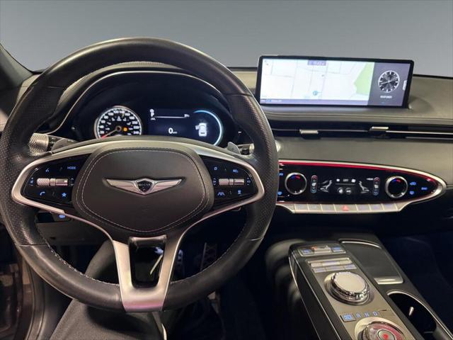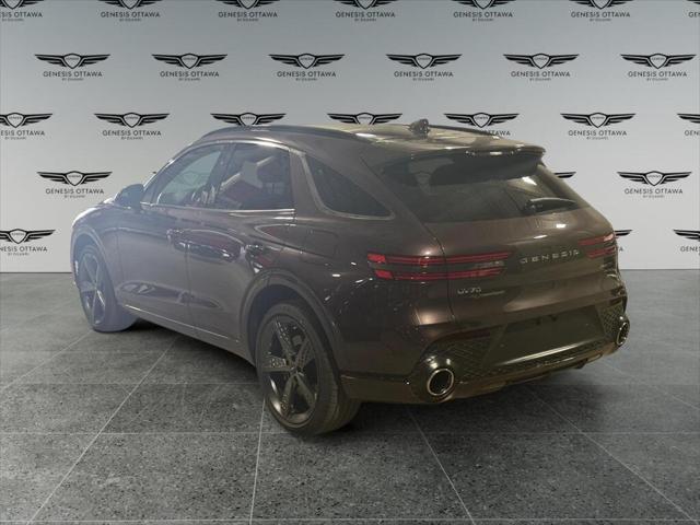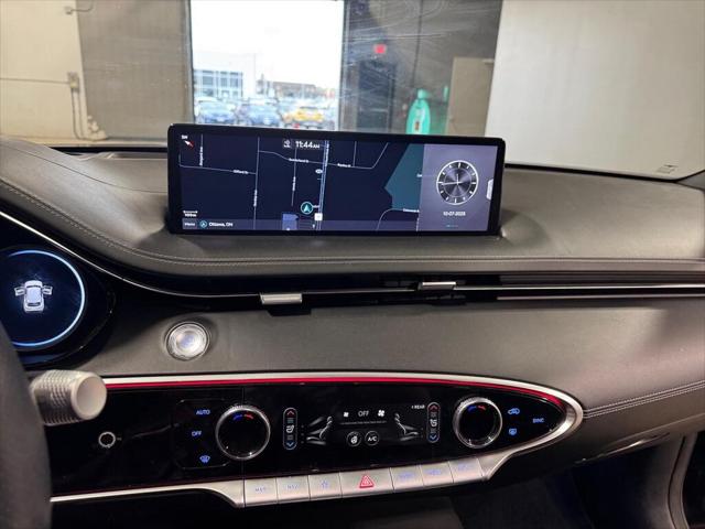 The 2022 Genesis GV70 3.5T Sport in a striking brown hue offers an AWD drivetrain that assures confident handling across diverse driving conditions. It combines sportiness with elegance delivering both agility and comfort. This SUV captivates with its chic exterior featuring dynamic lines and sophisticated alloy wheels. Step inside to be enveloped by a plush black interior boasting top-tier leather seats and aluminum accents that exude luxury and craftsmanship. Equipped with cutting-edge technology the GV70 includes a user-friendly navigation system a crisp heads-up display and seamless smart device integration. Safety and convenience are elevated with features like adaptive cruise control lane assist and parking sensorsmaking each journey safer and more enjoyable. For those who value refinement and advanced features the Genesis GV70 is a perfect choice. Whether you're navigating urban landscapes or enjoying weekend getaways this vehicle has something to offer every driver. Contact us today to explore this exceptional vehicle further.